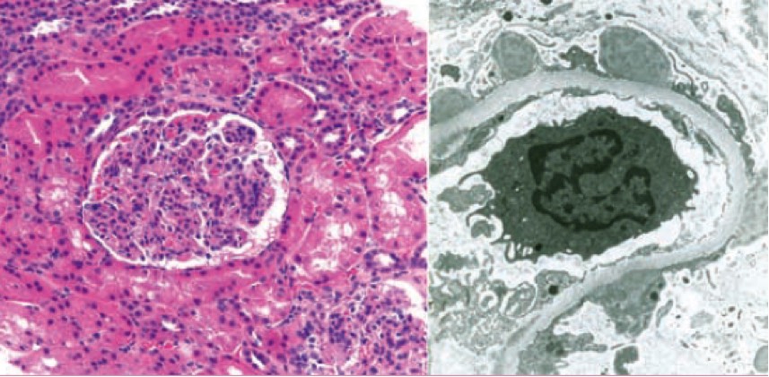 1023. У 10-летнего мальчика с лихорадкой и импетиго в анамнезе внезапно развилась олигурия и гематурия, данные биопсии почки и соответствующие результаты электронной микроскопии показаны на микрофотографии, диагноз _____ наиболее вероятен