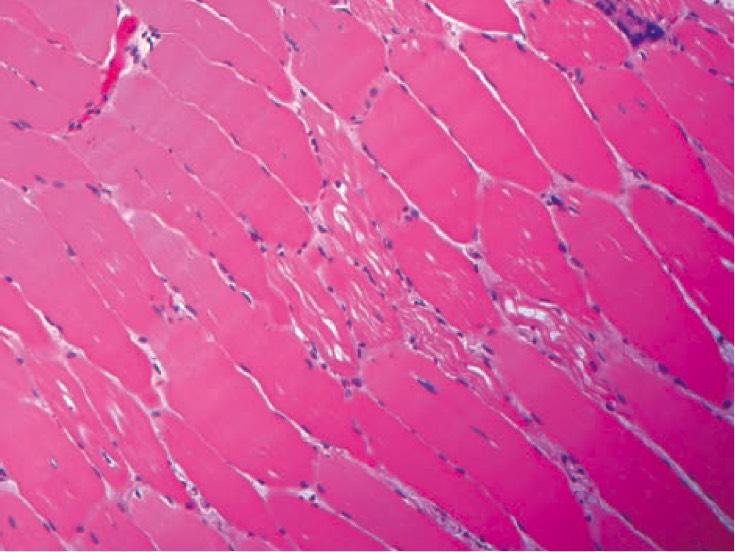 1059. У 66-летнего мужчины выраженная мышечная слабость и трудности при отлучении от аппарата ивл. биоптат поперечно-полосатой мышцы приведен на микрофотографии
