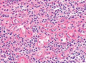 1070. 40-Летний пациент в течение года жаловался на отек в области правой подчелюстной железы, при пальпации область была чувствительна, уплотнена, выполнена резекция правой подчелюстной железы, результаты гистологического исследования образования приведены на микрофотографии