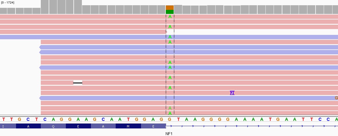 3165. Генетический вариант, выявленный в образце и представленный на скриншоте геномного браузера, в котором показано выравнивание на референсный геном человека прочтений, полученных методом ngs, является