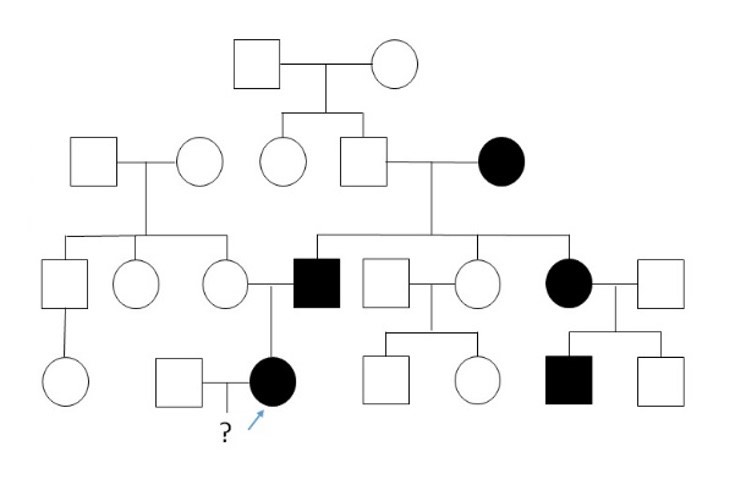 3373. Вероятность рождения детей с полидактилией у страдающей этим заболеванием консультирующейся женщины, родословная которой представлена на рисунке, в браке со здоровым мужчиной составляет (в процентах)