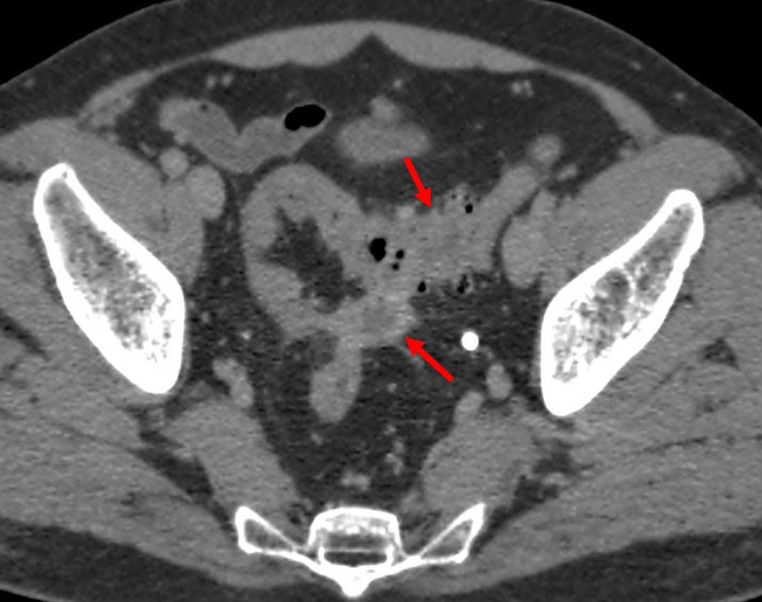 949. На представленном КТ снимке участок сигмовидной кишки с дивертикулами; стенки утолщены; в параколической клетчатке визуализируется жидкостное округлое образование диаметром 2,5 см с толстыми стенками, что по классификации осложнений дивертикулярной болезни соответствует картине