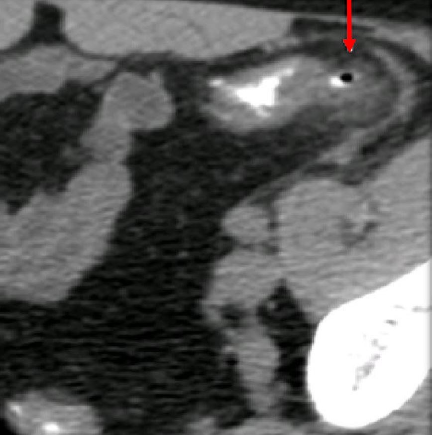 951. На представленном КТ снимке фрагмент сигмовидной кишки; визуализируется дивертикул с утолщенными стенками и локальной инфильтрацией вокруг, что по классификации осложнений дивертикулярной болезни соответствует картине