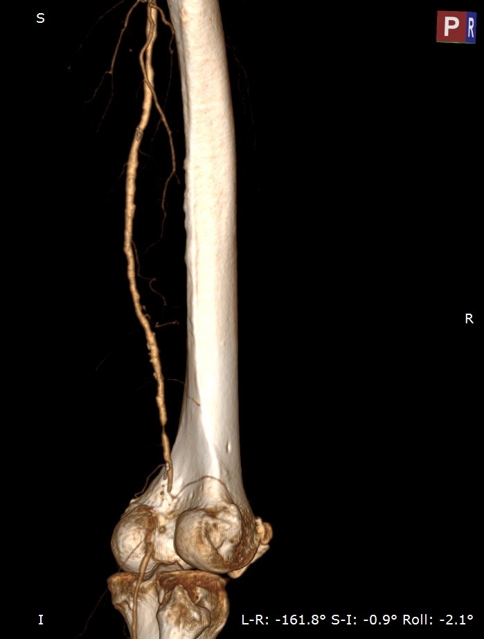 2178. Для лечения пациента с субокклюзией дистальной трети правой пба, с хронической окклюзией правой подколенной артерии (снимок мскт), клиникой перемежающей хромоты, хинк iib рекомендуется