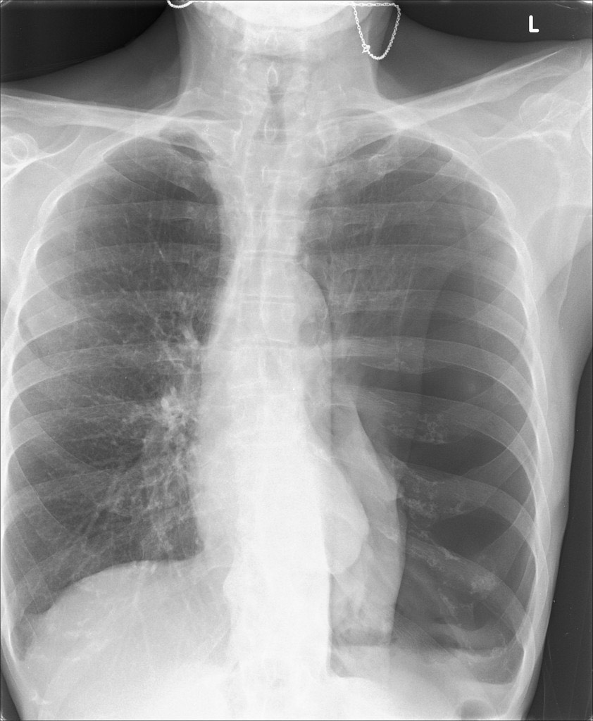 2819. У пациента с жалобами на одышку в покое на протяжении двух дней повышение температуры тела до 37,1°С, сердцебиение и гипотензия, рентгенологические данные, представленные на снимке,