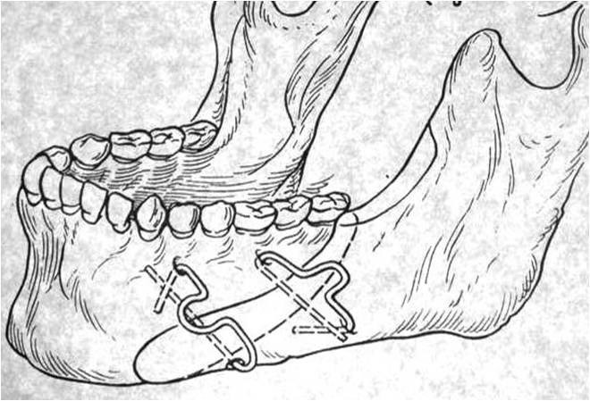 2303. На рисунке у пациента с переломом нижней челюсти остеосинтез фрагментов проведён с помощью