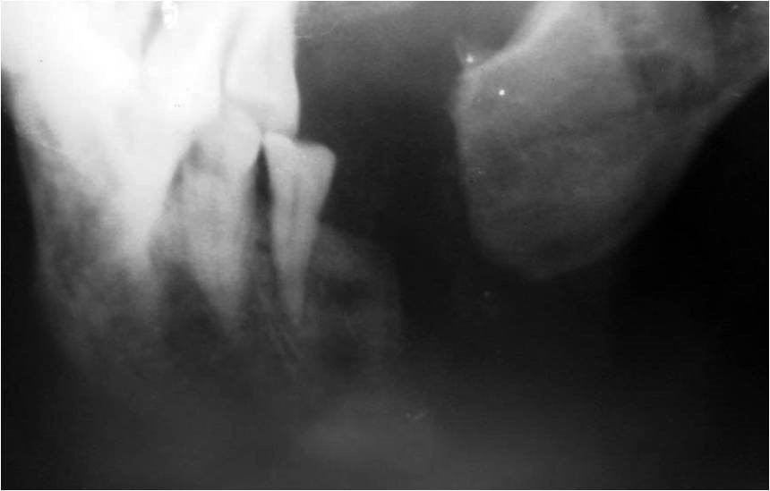 2304. На рентгенограмме у пациента с переломом нижней челюсти наблюдается осложнение в виде