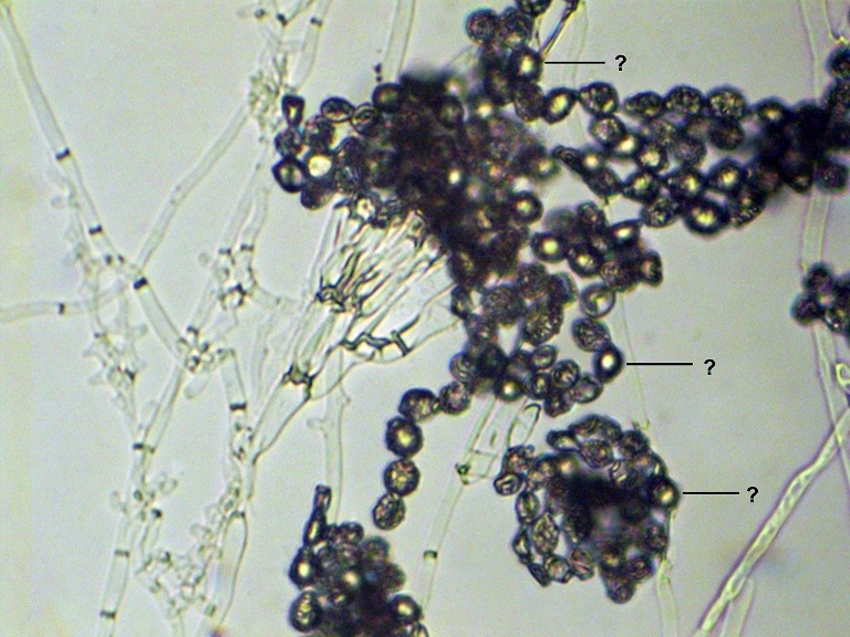 2052. На микрофотоснимке агарового блока penicillium sp. знаком «?» обозначены