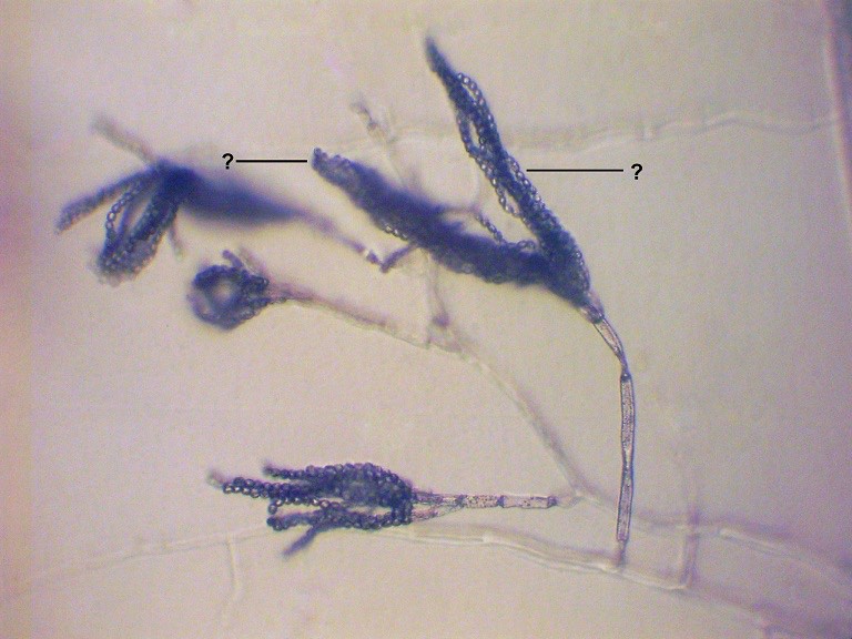 2054. На микрофотоснимке агарового блока penicillium sp. знаком «?» обозначены структуры из цепочек конидий, именуемые