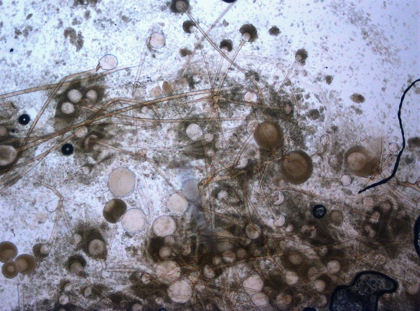 2061. Образование крупных спорангиев без апофизы, отсутствие ризоидов, как на снимке, характерны для мукоромицетов из рода