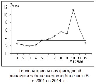 937. По представленному рисунку можно предположить, что заболеваемость болезнью в. характеризовалась