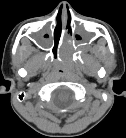 1258. У пациента 13 лет 1,5 года назад появилось затруднение носового дыхания и периодические выделения из носа, на КТ в основной пазухе, распространяясь в ячейки решетчатого лабиринта и носоглотку, разрушая левое большое и малое крыло клиновидной кости и распространяясь в левую крылонёбную ямку, определяется новообразование, активно накапливающее контрастный препарат, с неровными нечеткими контурами, что соответствует