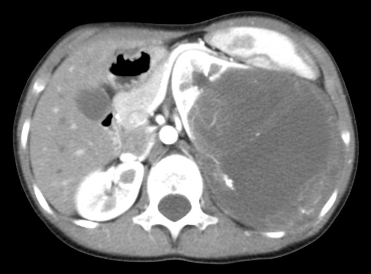 1386. Пациенту 8 лет с болями в левом боку в подреберье, интермиттирующей лихорадкой до 38,8⁰с проведено обследование и антибиотикотерапия, вследствие которых боли купировались, но сохранилась субфебрильная лихорадка, выполнили компьютерную томографию, патологическим процессом считают